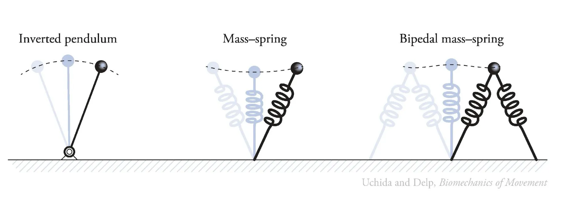 In its simplest form, we can think of humanoid walking as balancing an inverted pendulum with springs that store/output energy by alternating kinetic/potential energy (in a friction free world this is known as passive dynamics).
