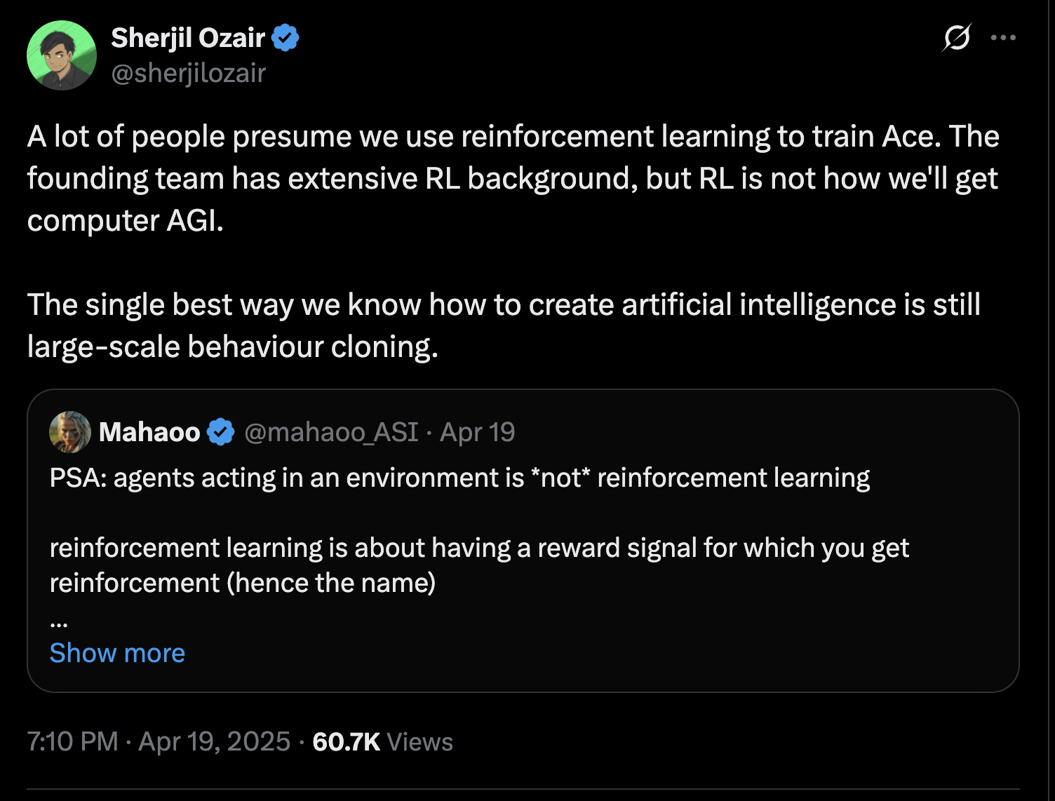 With both of these ideas in mind, it might be the case that we’re a lot closer to solving physical intelligence than we might realize and that an effective general reward model for the physical world plus sample demonstrations might be sufficient to build a general purpose robot model.