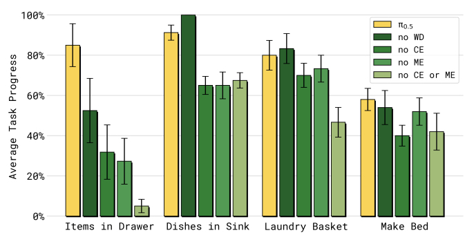 - confirms the importance of web-data (WD) for semantics understanding, cross-embodiment data (CE) and multi-environment data (ME) improve generalization and beat specialized models (on par with RT-2/RT-X takeaways)