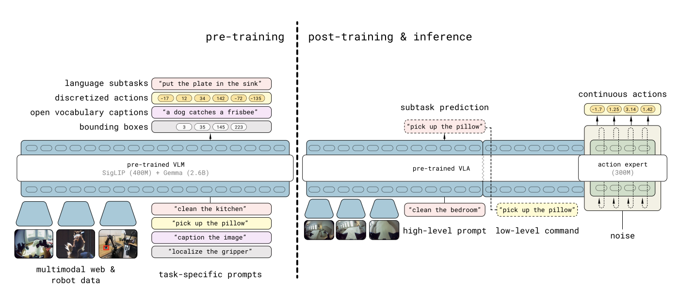 - discrete auto-regressive token decoding for high-level actions, continuous flow-matching for low-level motor commands