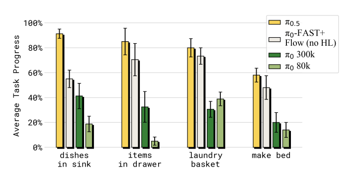- outperforms π0-FAST+Flow on both generalization and complex instruction following/long horizon tasks
