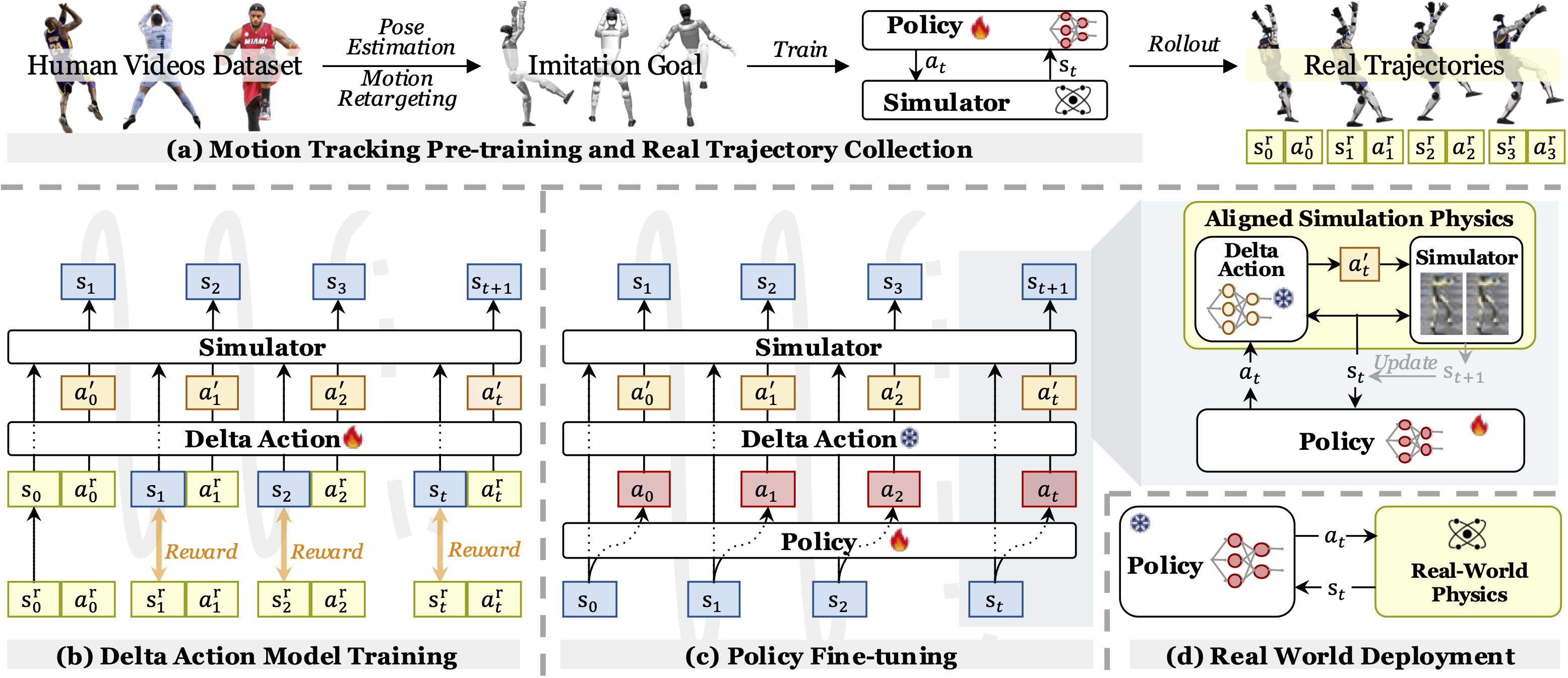 - fine-tune pre-trained policies with the delta action model integrated into the simulator to align effectively with real-world dynamics