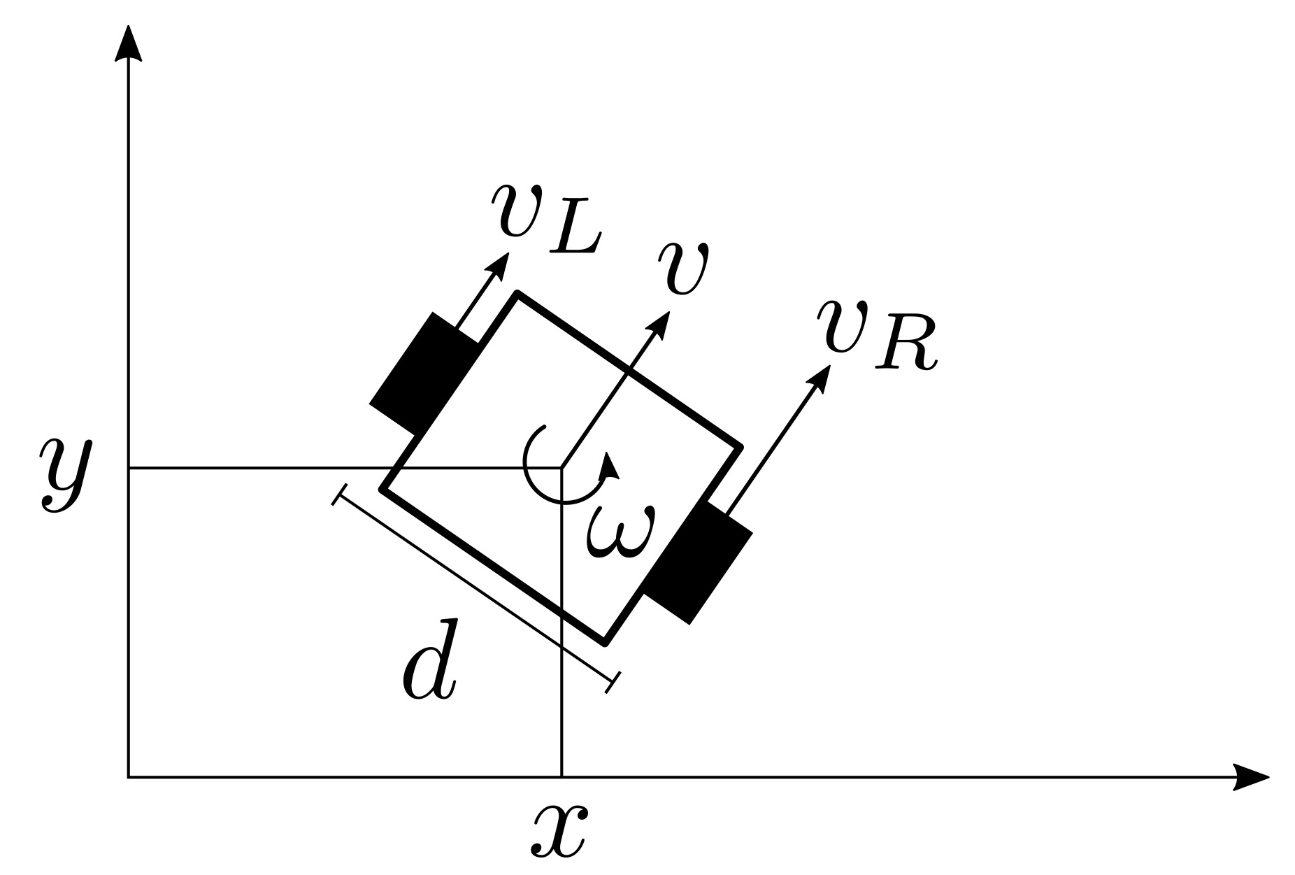 $$ \begin{bmatrix} v \ \omega \end{bmatrix} = \underbrace{ \begin{bmatrix} \frac{1}{2} & \frac{1}{2} \ -\frac{1}{d} & \frac{1}{d} \end{bmatrix} }_{D} \begin{bmatrix} v_L \ v_R \end{bmatrix} \Leftrightarrow \begin{bmatrix} v_L \ v_R \end{bmatrix} = D^{-1} \begin{bmatrix} v \ \omega \end{bmatrix} $$