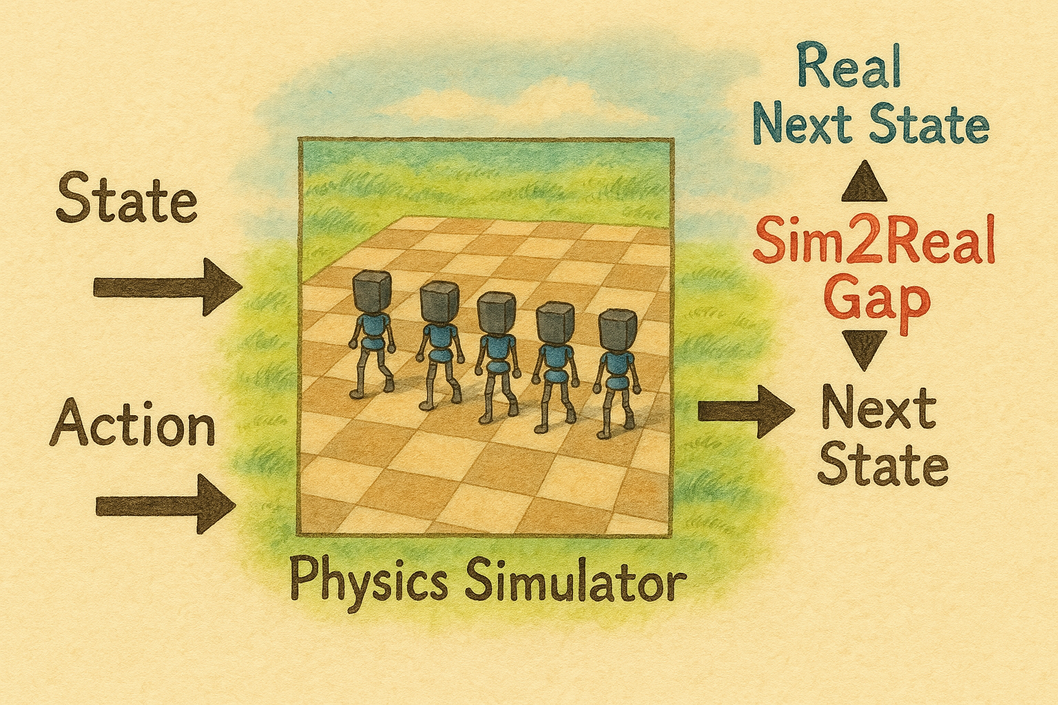 The sim2real gap is the difference between what the next state inside the simulator is and the one that happens in the real world: